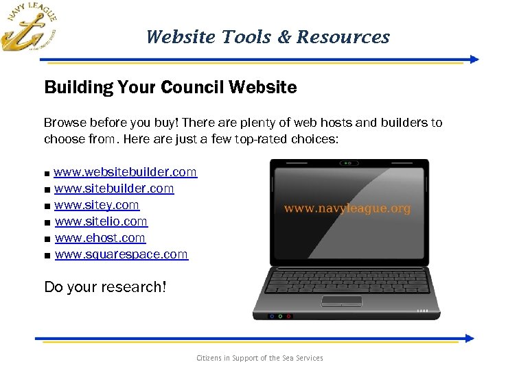 Website Tools & Resources Building Your Council Website Browse before you buy! There are plenty of web hosts and builders to choose from. Here are just a few top-rated choices: ■ www. websitebuilder. com ■ www. sitey. com ■ www. sitelio. com ■ www. ehost. com ■ www. squarespace. com Do your research! Citizens in Support of the Sea Services