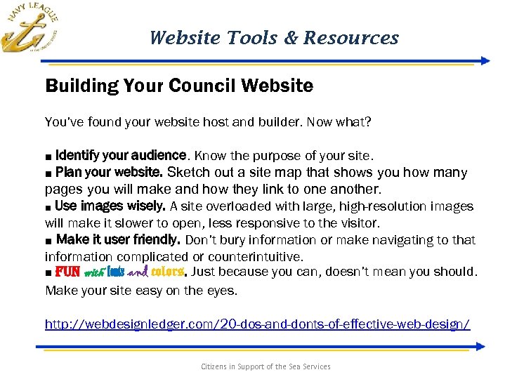 Website Tools & Resources Building Your Council Website You’ve found your website host and builder. Now what? ■ Identify your audience. Know the purpose of your site. ■ Plan your website. Sketch out a site map that shows you how many pages you will make and how they link to one another. ■ Use images wisely. A site overloaded with large, high-resolution images will make it slower to open, less responsive to the visitor. ■ Make it user friendly. Don’t bury information or make navigating to that information complicated or counterintuitive. ■ Fun with fonts and colors. Just because you can, doesn’t mean you should. Make your site easy on the eyes. http: //webdesignledger. com/20 -dos-and-donts-of-effective-web-design/ Citizens in Support of the Sea Services