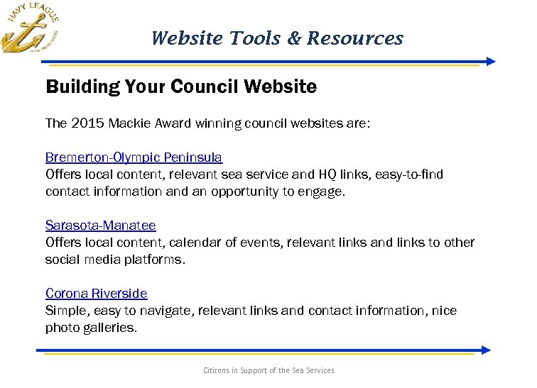 Website Tools & Resources Building Your Council Website The 2015 Mackie Award winning council websites are: Bremerton-Olympic Peninsula Offers local content, relevant sea service and HQ links, easy-to-find contact information and an opportunity to engage. Sarasota-Manatee Offers local content, calendar of events, relevant links and links to other social media platforms. Corona Riverside Simple, easy to navigate, relevant links and contact information, nice photo galleries. Citizens in Support of the Sea Services