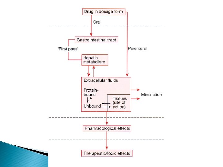 p. Ka – the p. H at which ½ of the molecules are ionized most drugs are either weakly basic or weakly acidic Basic drugs are highly ionized in acidic environment Acidic drugs are highly ionized in basic environment