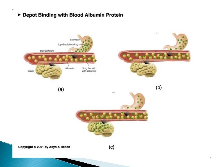 Absorption and Distribution Mostly a passive process - ◦ from higher conc to lower (in blood) Binding to plasma proteins ◦ results in a store of bound drug in plasma examples - 95 -99% - chlorpromazine, diazepam, imipramine 90 - 95% - valproate, propanolol, phenytoin