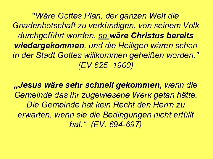 "Wäre Gottes Plan, der ganzen Welt die Gnadenbotschaft zu verkündigen, von seinem Volk durchgeführt worden, so wäre Christus bereits wiedergekommen, und die Heiligen wären schon in der Stadt Gottes willkommen geheißen worden. " (EV 625 1900) „Jesus wäre sehr schnell gekommen, wenn die Gemeinde das ihr zugewiesene Werk getan hätte. Die Gemeinde hat kein Recht den Herrn zu erwarten, wenn sie die Bedingungen nicht erfüllt hat. “ (EV. 694 -697)