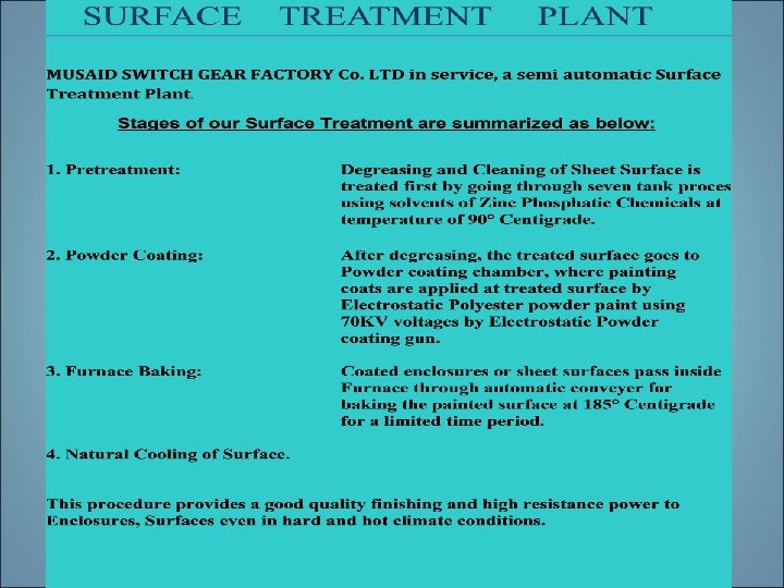 C. SURFACE TREATMENT & POWDER PAINT COATING PLANT S. No. MACHINE DESCRIPTION QTY. MAKE 1. Electric Powered Automatic Conveyer 122 Meter Length ( point load 80 kg, total load 4, 500 kg) 1 Intech Overseas India 2. Seven Tanks Process Sheet Treatment Plant (By Zinc Phosphastic Chemicals) With electric oven to dry the surface. 1 Intech Overseas India 3. Automatic Polyester Powder Coating Plant (With diesel burner, oven maintained temperature upto 180° Celsius). 1 Italy 4. Polyester Powder Thickness Tester. 1 ----