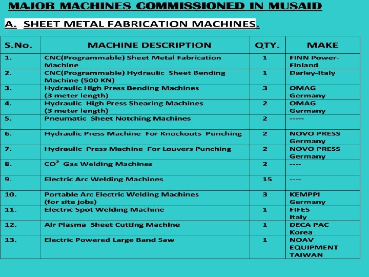 B. BUS BAR FABRICATION MACHINES. S. No. MACHINE DESCRIPTION QTY. MAKE 1. CNC (Programmable) Bus bar Fabrication Machine , 60 Tonnes (Multi Punch) 1 SUNRISE – Korea 2. Programmable Hydraulic Bus bar Bending Machines (Multi Punch) 2 NAM SUNG Korea 3. Programmable Hydraulic Bus bar Bending & Punching Machine (Multi Punch) 1 EUROMAC Korea 4. Hydraulic Bus bar Punching Press 5 NOVO PRESS Germany 5. Hydraulic Bus bar Cutting Press 2 NOVO PRESS Germany 6. Vertical Drilling & Milling Machine (Upto 40 mm) 2 China 7. Vertical Drilling & Milling Machine 2 LUNAN Continental Italy
