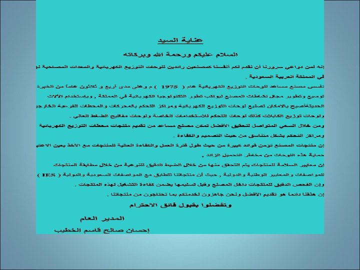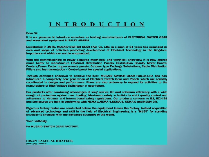 WEL COME MUSAID SWITCH GEAR FACTORY COMPANY LTD. P. O. BOX : 565 RIYADH 11383 NEW INDUSTRIAL AREA AL KHARJ ROAD-RIYADH-K. S. A TELEPHONE: 4984063/4981987 TELE FAX : 4982491 E-MAIL MUSAIDFACTORY@YAHOO. COM