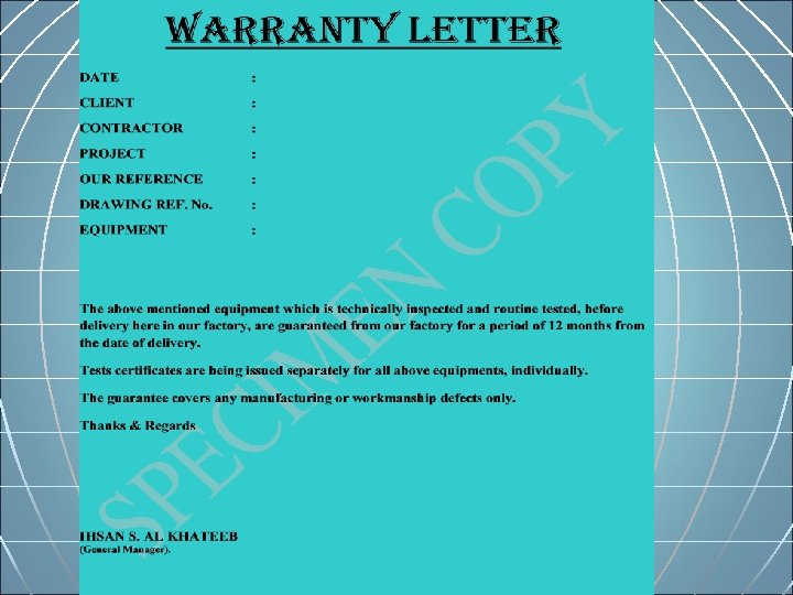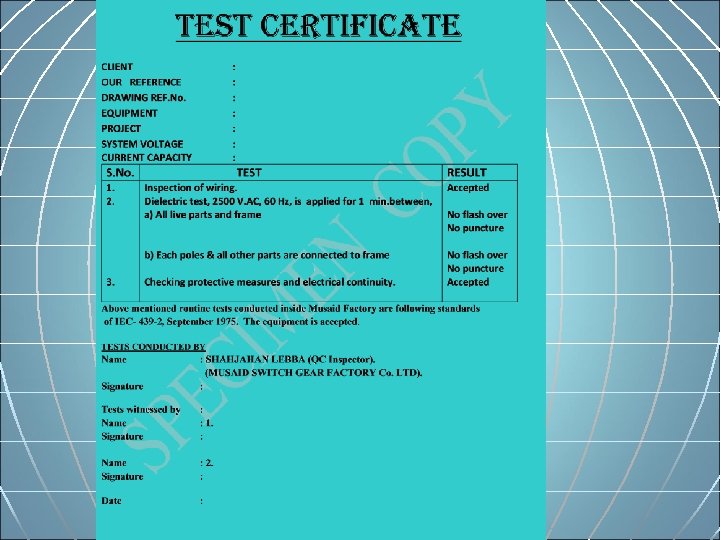 Optional accessories test use to conduct for all accessories such as motors, releasing coil, relays before and after assembling these devices inside the breakers and panels itself. Control and monitoring relays and measuring instruments are also checked before arranging these inside the required panels. All these visual inspections and electrical, mechanical tests are performed in the presence of any authorized person from client or consultant side for that we inform them before testing schedule and finally test certificate be issued to the client, at the time of delivery together with warranty letter. -: NOTHING FOLLOWS: -