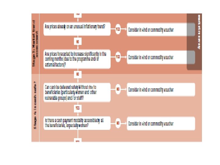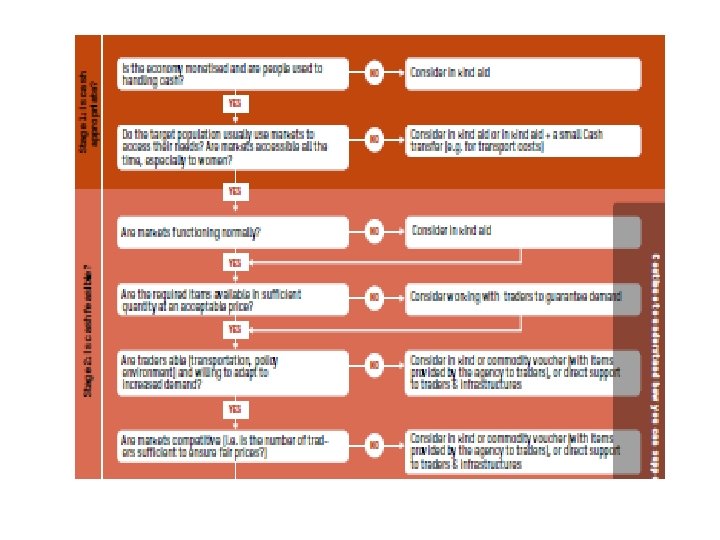 cash and market programming: agree or disagree? • Is it risky to deliver emergency relief through cash transfers as markets take time to recover after a crisis (and it might create inflation) • Delivering cash is more risky for people’s safety than inkind • When delivering cash transfers one is not sure of how people use aid • The choice between cash and in kind depends on needs, markets and risk analysis