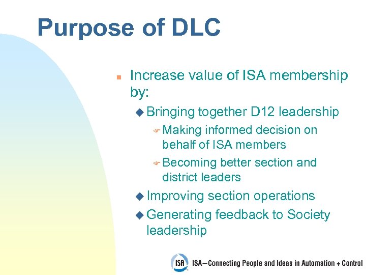 Purpose of DLC n Increase value of ISA membership by: u Bringing together D 12 leadership F Making informed decision on behalf of ISA members F Becoming better section and district leaders u Improving section operations u Generating feedback to Society leadership