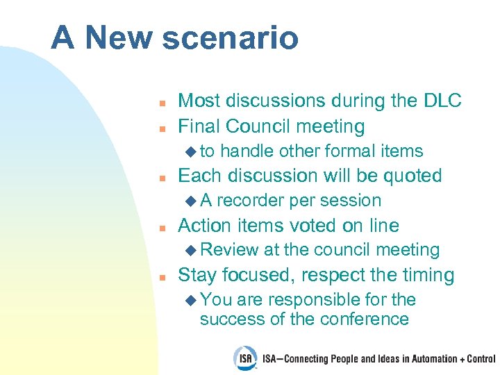 A New scenario n n Most discussions during the DLC Final Council meeting u to handle other formal items n Each discussion will be quoted u A recorder per session n Action items voted on line u Review at the council meeting n Stay focused, respect the timing u You are responsible for the success of the conference