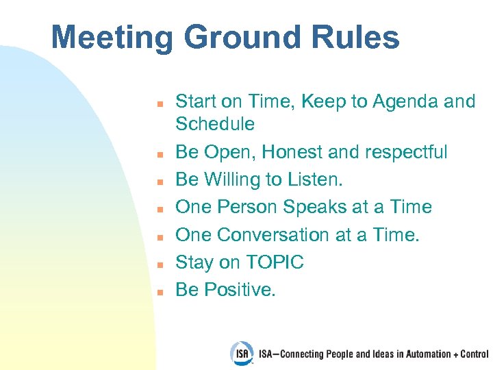 Meeting Ground Rules n n n n Start on Time, Keep to Agenda and Schedule Be Open, Honest and respectful Be Willing to Listen. One Person Speaks at a Time One Conversation at a Time. Stay on TOPIC Be Positive.