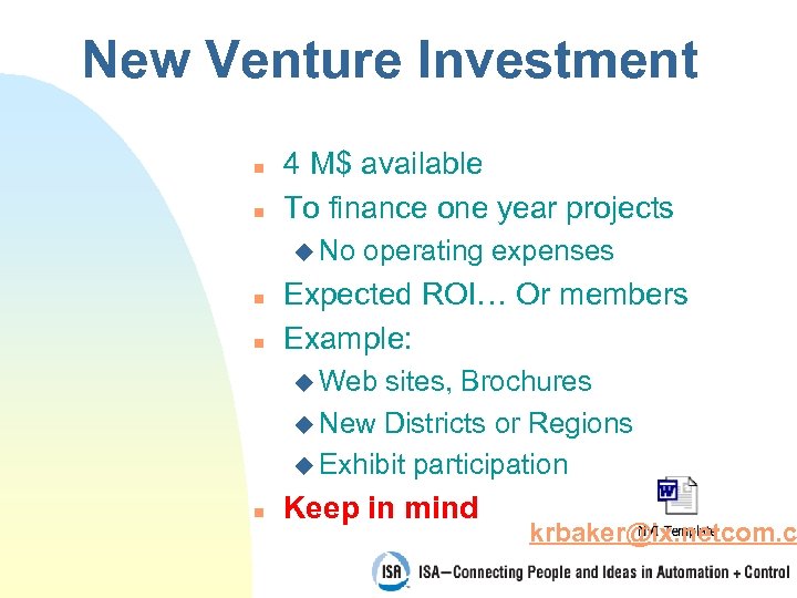 New Venture Investment n n 4 M$ available To finance one year projects u No operating expenses n n Expected ROI… Or members Example: u Web sites, Brochures u New Districts or Regions u Exhibit participation n Keep in mind krbaker@ix. netcom. c