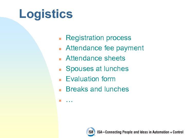 Logistics n n n n Registration process Attendance fee payment Attendance sheets Spouses at lunches Evaluation form Breaks and lunches …