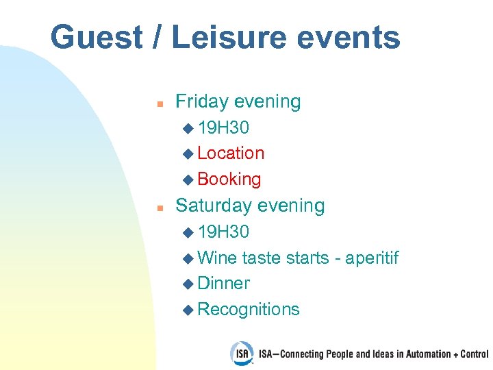 Guest / Leisure events n Friday evening u 19 H 30 u Location u Booking n Saturday evening u 19 H 30 u Wine taste starts - aperitif u Dinner u Recognitions