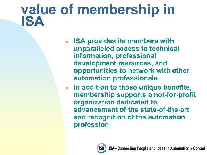 value of membership in ISA n n ISA provides its members with unparalleled access to technical information, professional development resources, and opportunities to network with other automation professionals. In addition to these unique benefits, membership supports a not-for-profit organization dedicated to advancement of the state-of-the-art and recognition of the automation profession