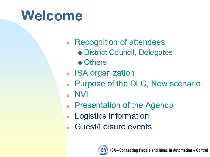Welcome n Recognition of attendees u District Council, Delegates u Others n n n ISA organization Purpose of the DLC, New scenario NVI Presentation of the Agenda Logistics information Guest/Leisure events