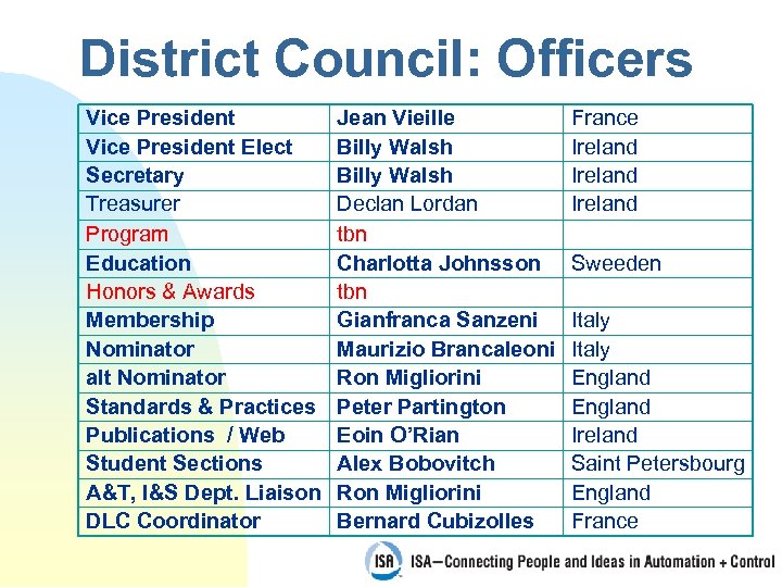 District Council: Officers Vice President Elect Secretary Treasurer Program Education Honors & Awards Membership Nominator alt Nominator Standards & Practices Publications / Web Student Sections A&T, I&S Dept. Liaison DLC Coordinator Jean Vieille Billy Walsh Declan Lordan tbn Charlotta Johnsson tbn Gianfranca Sanzeni Maurizio Brancaleoni Ron Migliorini Peter Partington Eoin O’Rian Alex Bobovitch Ron Migliorini Bernard Cubizolles France Ireland Sweeden Italy England Ireland Saint Petersbourg England France