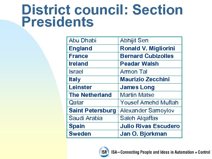 District council: Section Presidents Abu Dhabi England France Ireland Israel Italy Leinster The Netherland Qatar Saint Petersburg Saudi Arabia Spain Sweden Abhijit Sen Ronald V. Migliorini Bernard Cubizolles Peadar Walsh Armon Tal Maurizio Zecchini James Long Martin Matse Yousef Amehd Muftah Alexander Samoylov Saleh Alqaffas Julio Rivas Escudero Jan O. Bjorkman