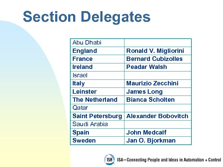 Section Delegates Abu Dhabi England France Ireland Israel Italy Leinster The Netherland Qatar Saint Petersburg Saudi Arabia Spain Sweden Ronald V. Migliorini Bernard Cubizolles Peadar Walsh Maurizio Zecchini James Long Bianca Scholten Alexander Bobovitch John Medcalf Jan O. Bjorkman