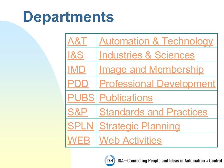 Departments A&T I&S IMD PDD PUBS S&P SPLN WEB Automation & Technology Industries & Sciences Image and Membership Professional Development Publications Standards and Practices Strategic Planning Web Activities