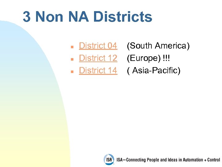 3 Non NA Districts n n n District 04 (South America) District 12 (Europe) !!! District 14 ( Asia-Pacific)