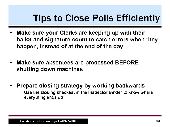 Tips to Close Polls Efficiently • Make sure your Clerks are keeping up with their ballot and signature count to catch errors when they happen, instead of at the end of the day • Make sure absentees are processed BEFORE shutting down machines • Prepare closing strategy by working backwards – Use the closing checklist in the Inspector Binder to know where everything ends up Questions on Election Day? Call 327 -2000 102