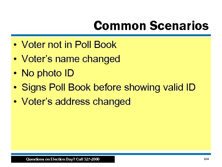 Common Scenarios • • • Voter not in Poll Book Voter’s name changed No photo ID Signs Poll Book before showing valid ID Voter’s address changed Questions on Election Day? Call 327 -2000 104