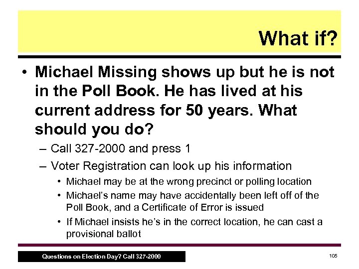 What if? • Michael Missing shows up but he is not in the Poll Book. He has lived at his current address for 50 years. What should you do? – Call 327 2000 and press 1 – Voter Registration can look up his information • Michael may be at the wrong precinct or polling location • Michael’s name may have accidentally been left off of the Poll Book, and a Certificate of Error is issued • If Michael insists he’s in the correct location, he can cast a provisional ballot Questions on Election Day? Call 327 -2000 105