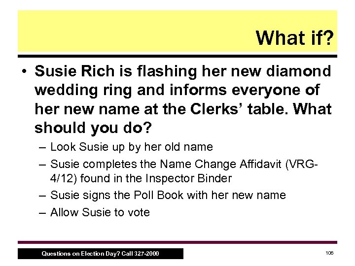 What if? • Susie Rich is flashing her new diamond wedding ring and informs everyone of her new name at the Clerks’ table. What should you do? – Look Susie up by her old name – Susie completes the Name Change Affidavit (VRG 4/12) found in the Inspector Binder – Susie signs the Poll Book with her new name – Allow Susie to vote Questions on Election Day? Call 327 -2000 106