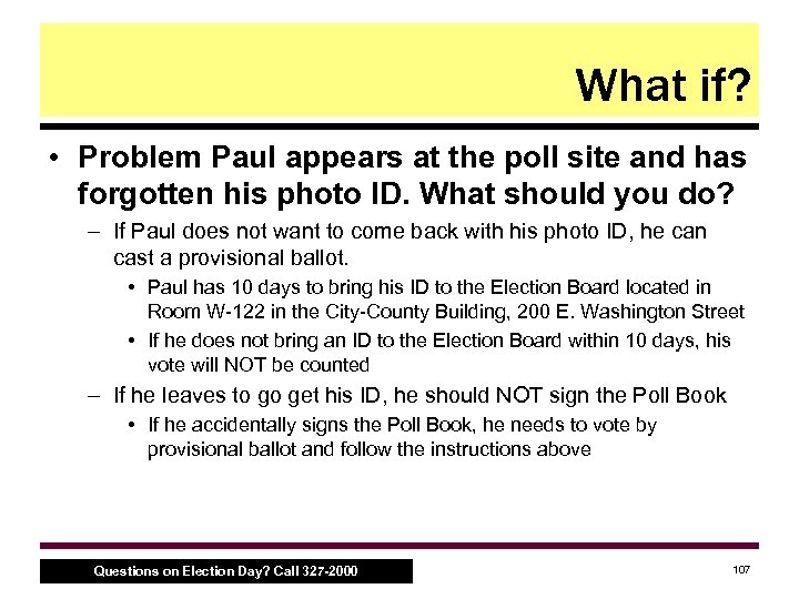 What if? • Problem Paul appears at the poll site and has forgotten his photo ID. What should you do? – If Paul does not want to come back with his photo ID, he can cast a provisional ballot. • Paul has 10 days to bring his ID to the Election Board located in Room W 122 in the City County Building, 200 E. Washington Street • If he does not bring an ID to the Election Board within 10 days, his vote will NOT be counted – If he leaves to go get his ID, he should NOT sign the Poll Book • If he accidentally signs the Poll Book, he needs to vote by provisional ballot and follow the instructions above Questions on Election Day? Call 327 -2000 107