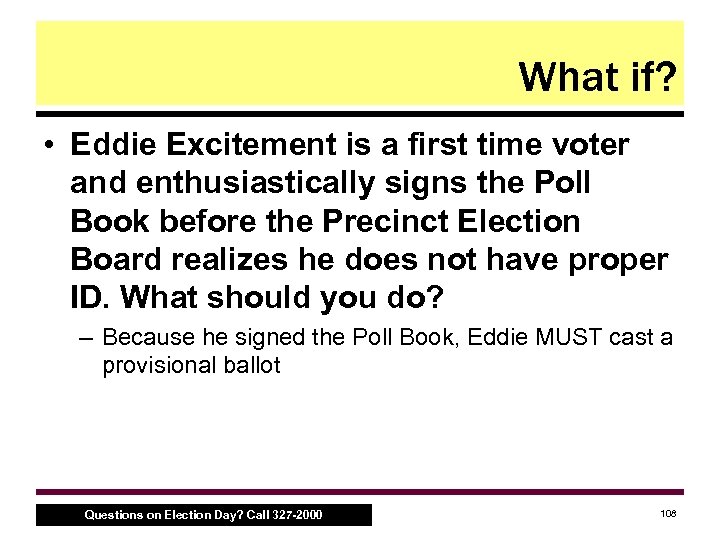 What if? • Eddie Excitement is a first time voter and enthusiastically signs the Poll Book before the Precinct Election Board realizes he does not have proper ID. What should you do? – Because he signed the Poll Book, Eddie MUST cast a provisional ballot Questions on Election Day? Call 327 -2000 108