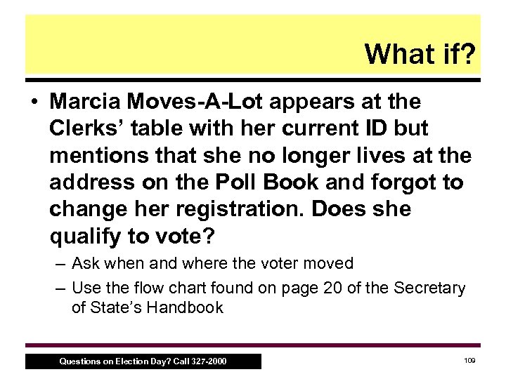 What if? • Marcia Moves-A-Lot appears at the Clerks’ table with her current ID but mentions that she no longer lives at the address on the Poll Book and forgot to change her registration. Does she qualify to vote? – Ask when and where the voter moved – Use the flow chart found on page 20 of the Secretary of State’s Handbook Questions on Election Day? Call 327 -2000 109