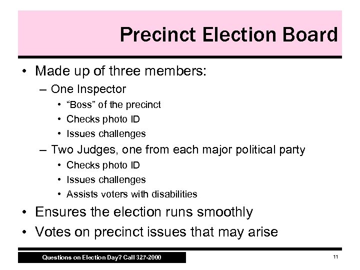 Precinct Staffing • Up to five poll workers per precinct: – Inspector – Two Judges – Two Clerks • Election Board and county Democratic party are responsible for assigning Inspectors • Two major political parties are responsible for assigning Judges and Clerks • Clerks and Judges may work a half day – Inspectors must work a full day Questions on Election Day? Call 327 -2000 10