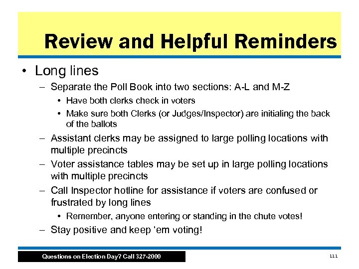 Review and Reminders • • Review and Helpful Reminders Early Voting Supply Pick Up and Drop Off Arrive at 5 Patience! Other Resources Questions? Call 327 2000 Questions on Election Day? Call 327 -2000 110