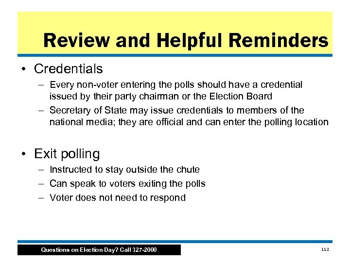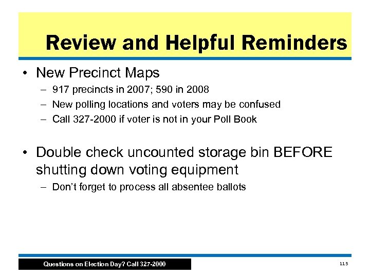 Review and Helpful Reminders • Credentials – Every non voter entering the polls should have a credential issued by their party chairman or the Election Board – Secretary of State may issue credentials to members of the national media; they are official and can enter the polling location • Exit polling – Instructed to stay outside the chute – Can speak to voters exiting the polls – Voter does not need to respond Questions on Election Day? Call 327 -2000 112
