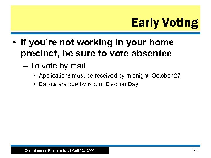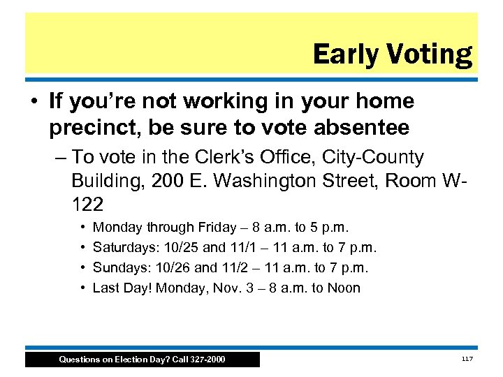 Early Voting • If you’re not working in your home precinct, be sure to vote absentee – To vote by mail • Applications must be received by midnight, October 27 • Ballots are due by 6 p. m. Election Day Questions on Election Day? Call 327 -2000 116