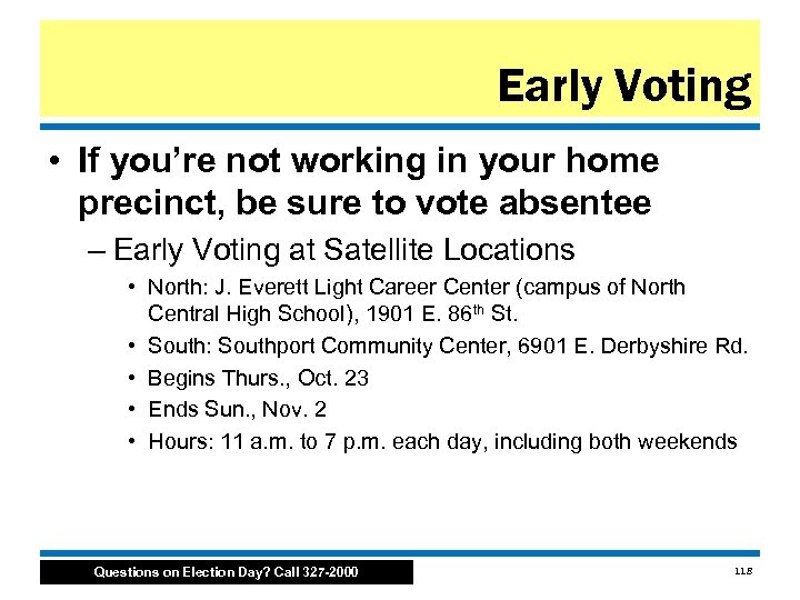 Early Voting • If you’re not working in your home precinct, be sure to vote absentee – Early Voting at Satellite Locations • North: J. Everett Light Career Center (campus of North Central High School), 1901 E. 86 th St. • South: Southport Community Center, 6901 E. Derbyshire Rd. • Begins Thurs. , Oct. 23 • Ends Sun. , Nov. 2 • Hours: 11 a. m. to 7 p. m. each day, including both weekends Questions on Election Day? Call 327 -2000 118