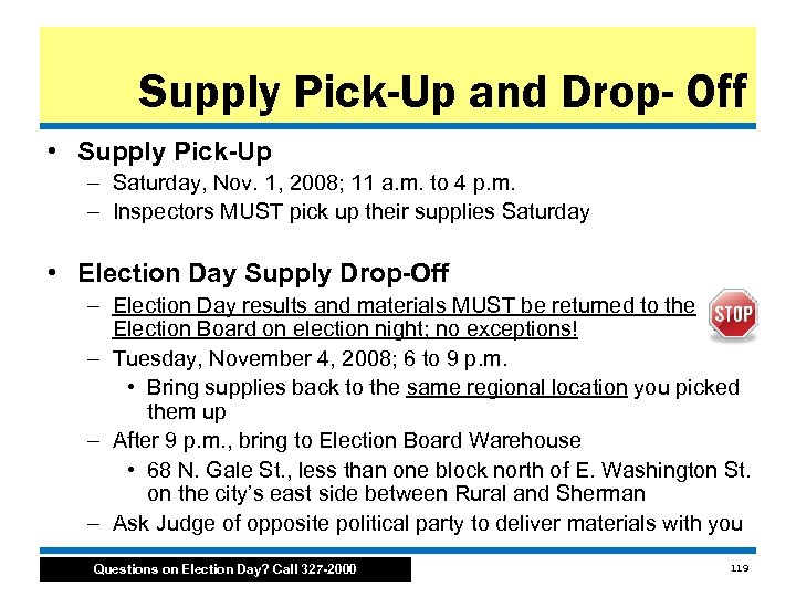 Supply Pick-Up and Drop- Off • Supply Pick-Up – Saturday, Nov. 1, 2008; 11 a. m. to 4 p. m. – Inspectors MUST pick up their supplies Saturday • Election Day Supply Drop-Off – Election Day results and materials MUST be returned to the Election Board on election night; no exceptions! – Tuesday, November 4, 2008; 6 to 9 p. m. • Bring supplies back to the same regional location you picked them up – After 9 p. m. , bring to Election Board Warehouse • 68 N. Gale St. , less than one block north of E. Washington St. on the city’s east side between Rural and Sherman – Ask Judge of opposite political party to deliver materials with you Questions on Election Day? Call 327 -2000 119