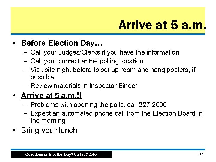 Arrive at 5 a. m. • Before Election Day… – Call your Judges/Clerks if you have the information – Call your contact at the polling location – Visit site night before to set up room and hang posters, if possible – Review materials in Inspector Binder • Arrive at 5 a. m. !! – Problems with opening the polls, call 327 2000 – Expect an automated phone call from the Election Board in the morning • Bring your lunch Questions on Election Day? Call 327 -2000 120