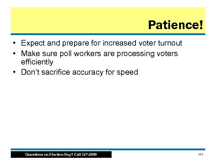 Patience! • Expect and prepare for increased voter turnout • Make sure poll workers are processing voters efficiently • Don’t sacrifice accuracy for speed Questions on Election Day? Call 327 -2000 121