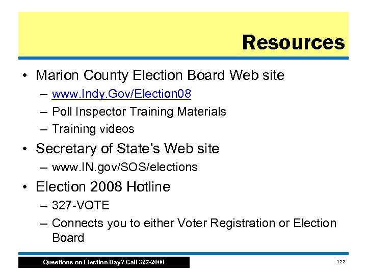 Resources • Marion County Election Board Web site – www. Indy. Gov/Election 08 – Poll Inspector Training Materials – Training videos • Secretary of State’s Web site – www. IN. gov/SOS/elections • Election 2008 Hotline – 327 VOTE – Connects you to either Voter Registration or Election Board Questions on Election Day? Call 327 -2000 122