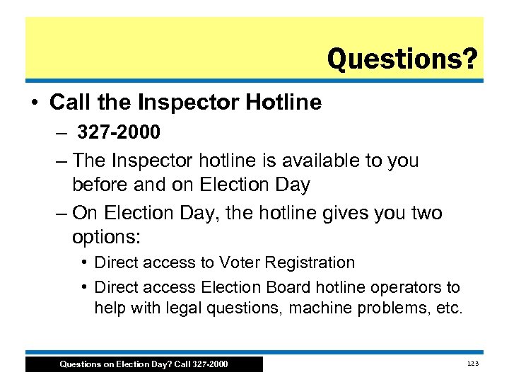 Questions? • Call the Inspector Hotline – 327 -2000 – The Inspector hotline is available to you before and on Election Day – On Election Day, the hotline gives you two options: • Direct access to Voter Registration • Direct access Election Board hotline operators to help with legal questions, machine problems, etc. Questions on Election Day? Call 327 -2000 123