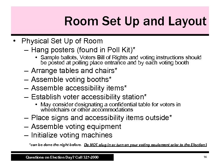 Preparing for Voters • Arrive at 5 a. m. ! • Set up a chute up extending 50 feet out from the entrance to the room where people vote – No campaigning (leaflets, palm cards, posters, etc. ) in chute • Set up room • Other administrative duties – – Sign Oaths and Affidavits (found in the Inspector Binder) Inventory and sort supplies Pass out credentials to poll workers Ask Clerks to prepare the Poll Book by adding alphabet tabs (found in the zipper pack of Inspector Binder) Questions on Election Day? Call 327 -2000 13