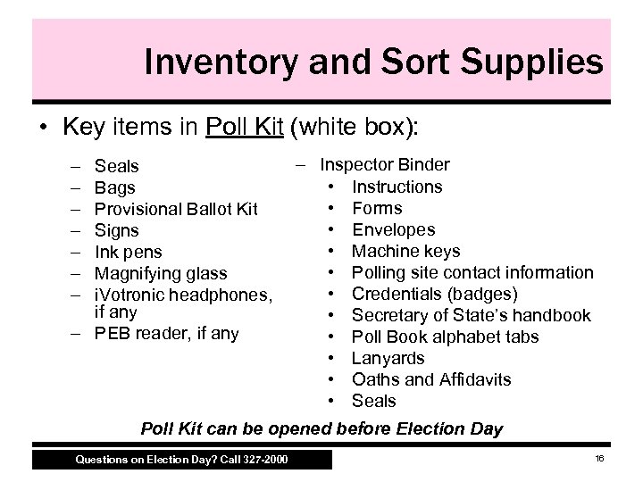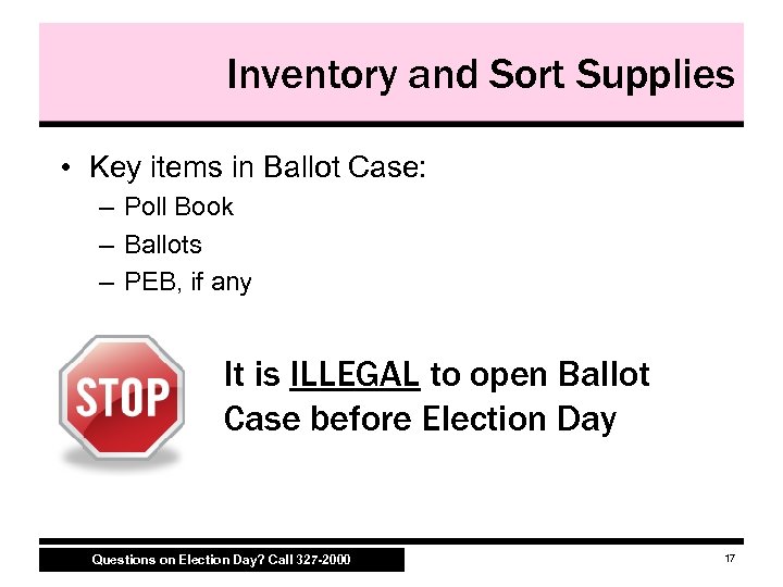 Inventory and Sort Supplies • Key items in Poll Kit (white box): – – – – Seals Bags Provisional Ballot Kit Signs Ink pens Magnifying glass i. Votronic headphones, if any – PEB reader, if any – Inspector Binder • Instructions • Forms • Envelopes • Machine keys • Polling site contact information • Credentials (badges) • Secretary of State’s handbook • Poll Book alphabet tabs • Lanyards • Oaths and Affidavits • Seals Poll Kit can be opened before Election Day Questions on Election Day? Call 327 -2000 16