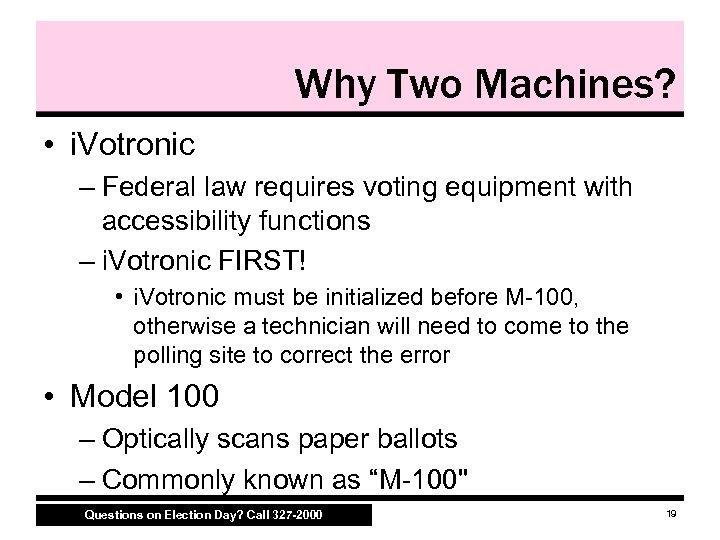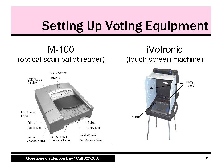 Setting Up Voting Equipment M 100 i. Votronic (optical scan ballot reader) (touch screen machine) Questions on Election Day? Call 327 -2000 18