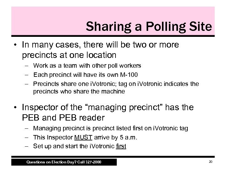 Why Two Machines? • i. Votronic – Federal law requires voting equipment with accessibility functions – i. Votronic FIRST! • i. Votronic must be initialized before M 100, otherwise a technician will need to come to the polling site to correct the error • Model 100 – Optically scans paper ballots – Commonly known as “M 100" Questions on Election Day? Call 327 -2000 19