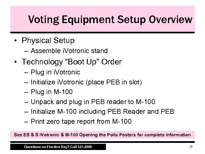 Voting Equipment Setup Overview • Physical Setup – Assemble i. Votronic stand • Technology “Boot Up” Order – – – Plug in i. Votronic Initialize i. Votronic (place PEB in slot) Plug in M 100 Unpack and plug in PEB reader to M 100 Initialize M 100 including PEB Reader and PEB Print zero tape report from M 100 See ES & S i. Votronic & M-100 Opening the Polls Posters for complete information Questions on Election Day? Call 327 -2000 22