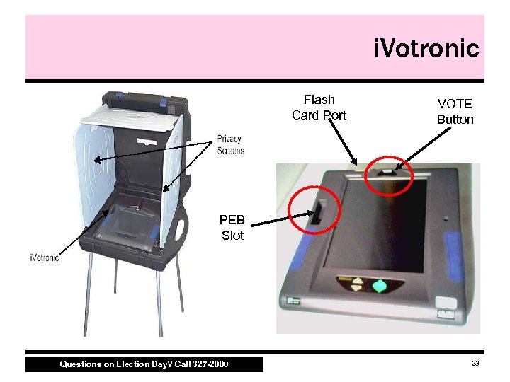 i. Votronic Flash Card Port VOTE Button PEB Slot Questions on Election Day? Call 327 -2000 23