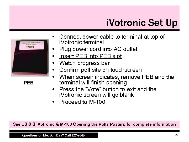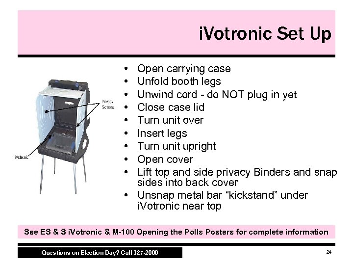 i. Votronic Set Up • • • Open carrying case Unfold booth legs Unwind cord do NOT plug in yet Close case lid Turn unit over Insert legs Turn unit upright Open cover Lift top and side privacy Binders and snap sides into back cover • Unsnap metal bar “kickstand” under i. Votronic near top See ES & S i. Votronic & M-100 Opening the Polls Posters for complete information Questions on Election Day? Call 327 -2000 24
