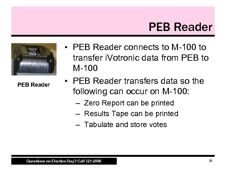 PEB Reader • PEB Reader connects to M 100 to transfer i. Votronic data from PEB to M 100 • PEB Reader transfers data so the following can occur on M 100: – Zero Report can be printed – Results Tape can be printed – Tabulate and store votes Questions on Election Day? Call 327 -2000 26