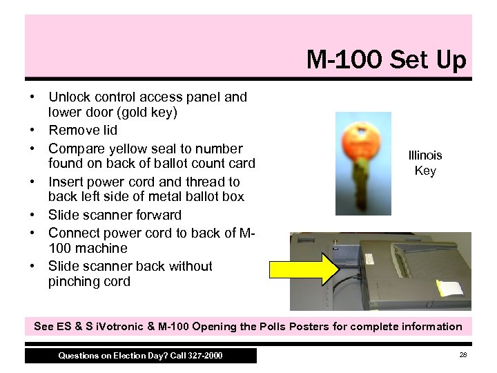 M-100 Set Up • Unlock control access panel and lower door (gold key) • Remove lid • Compare yellow seal to number found on back of ballot count card • Insert power cord and thread to back left side of metal ballot box • Slide scanner forward • Connect power cord to back of M 100 machine • Slide scanner back without pinching cord Illinois Key See ES & S i. Votronic & M-100 Opening the Polls Posters for complete information Questions on Election Day? Call 327 -2000 28